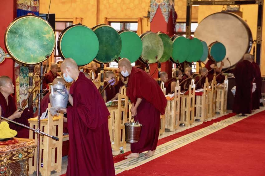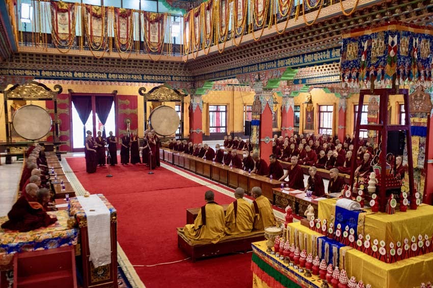 Kyabje Yongzin Mingyur Rinpoche visited his monastery during the gathering, where he bestowed teachings on what to adopt and what to abandon, led the nuns in meditation practice, and presided over a session of the debate competition.